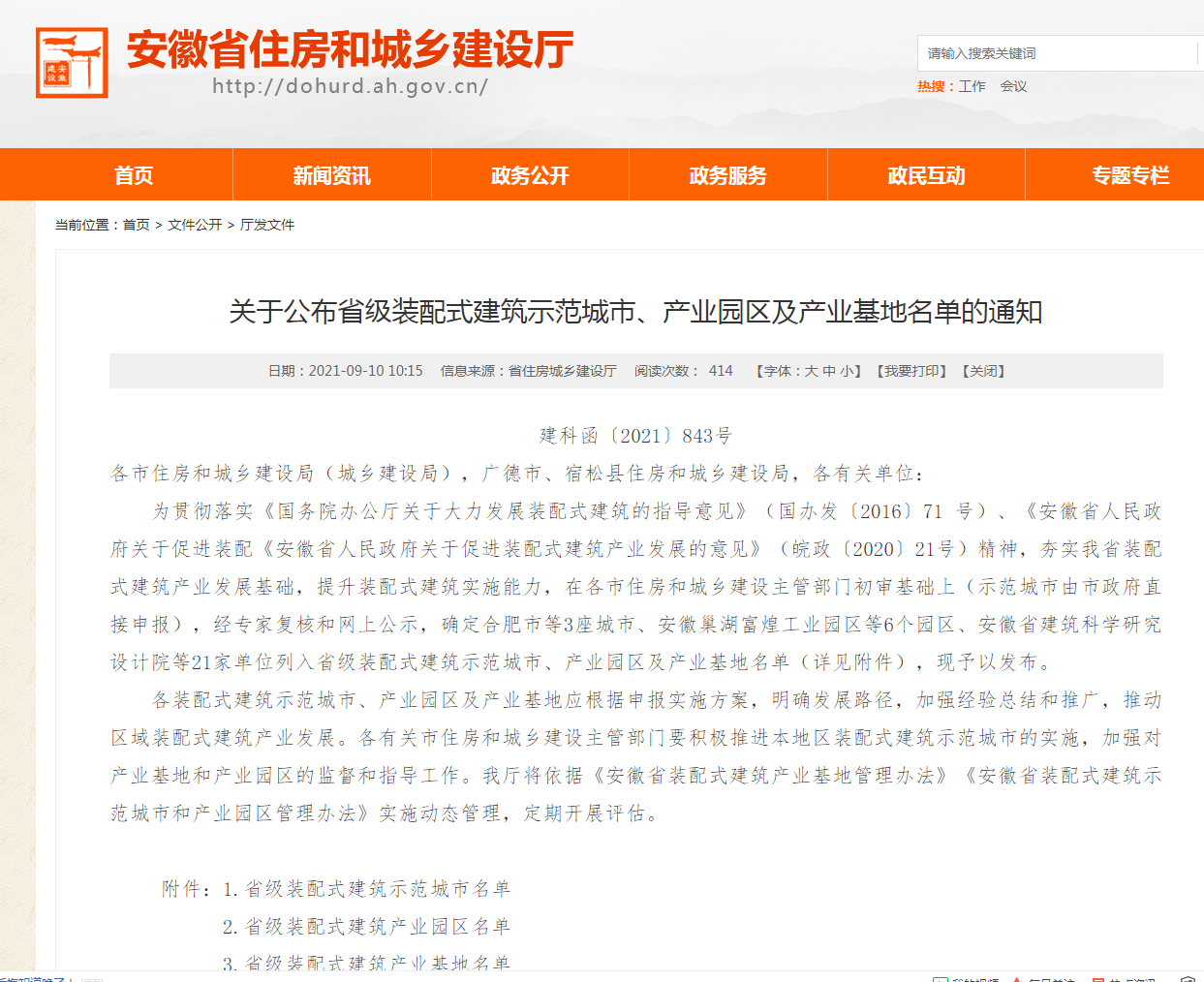 9月10日,安徽省住房和城鄉(xiāng)建設(shè)廳公布了省級裝配式建筑示范城市、產(chǎn)業(yè)園區(qū)及產(chǎn)業(yè)基地的名單,安徽富煌鋼構(gòu)股份有限公司所在的富煌工業(yè)園成功入選省級裝配式建筑產(chǎn)業(yè)園區(qū)名單,旗下的安徽富煌建筑科技有限公司、安徽富煌工程科技有限公司、安徽富煌建筑設(shè)計研究有限公司成功入選省級裝配式建筑產(chǎn)業(yè)基地名單,此次全省僅有6個園區(qū)、21家單位被安徽省住建廳授予省級裝配式建筑產(chǎn)業(yè)園區(qū)和省級裝配式建筑產(chǎn)業(yè)基地稱號。