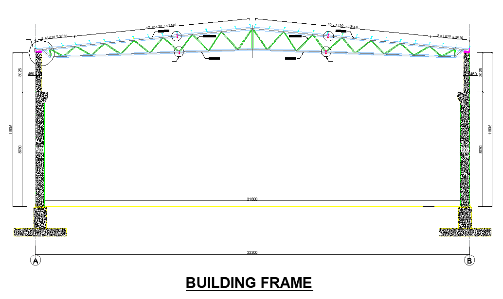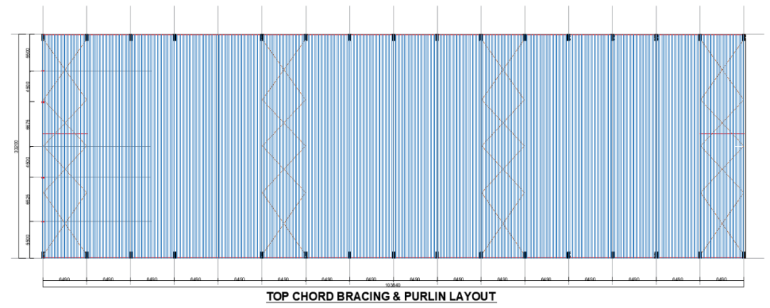該項(xiàng)目為桁架式輕鋼屋面廠房結(jié)構(gòu),總長(zhǎng)104米,寬33.2米,檐口高度12米,主體采用平面矩形管桁架結(jié)構(gòu),并在桁架上下弦設(shè)置屋面支撐。項(xiàng)目涵蓋鋼屋架、檁條、抗風(fēng)柱、吊車梁及雨棚等部分的設(shè)計(jì)與加工制作,總用鋼量約170噸。項(xiàng)目設(shè)計(jì)充分考慮當(dāng)?shù)厥褂眯枨?,縱向布置兩臺(tái)10噸吊車,西側(cè)山墻面另設(shè)5噸吊車,結(jié)構(gòu)整體坐落于已完工的混凝土柱上,兼顧實(shí)用性與安全性。