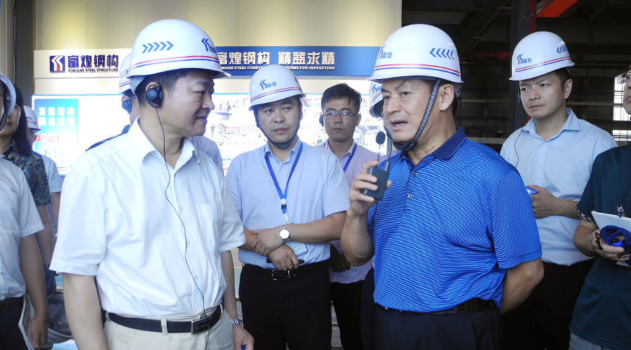 在富煌集團董事長楊俊斌的陪同下,張東強一行領導對產(chǎn)業(yè)園區(qū)進行了全面系統(tǒng)的考察,包括已建成和在建的項目:建筑科技研發(fā)基地、富煌鋼構(gòu)智能制造基地、建筑科技研發(fā)中心、會議中心、文化中心、裝配式建筑研發(fā)試驗基地、智能車庫研發(fā)試驗基地等??疾爝^程中,對于富煌集團在黃麓鎮(zhèn)建筑科創(chuàng)小鎮(zhèn)方面的意義,張東強一行領導給予了充分的肯定并提出了建設性意見與建議。