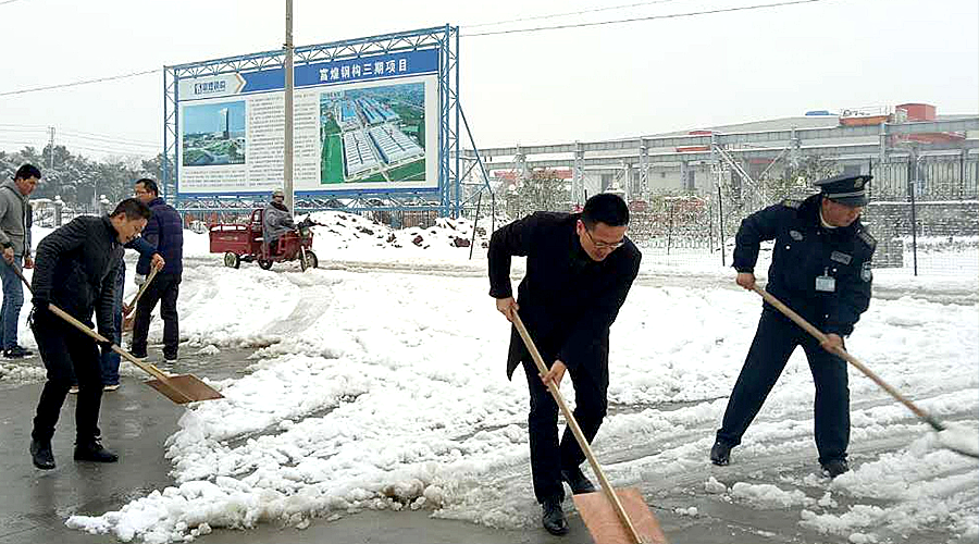 1月3-4日,巢湖迎來今年立冬以來的第一場降雪,鵝毛般的大雪紛紛灑灑的落下,整個巢湖大地披上了一層銀裝。走進富煌工業(yè)園區(qū),大家紛紛感嘆猶如銀裝素裹,分外妖嬈!但是厚厚的積雪同時也給員工們的出行及生產(chǎn)活動帶來了諸多不便,為暢通交通,安全生產(chǎn),4日及5日上午,富煌集團及園區(qū)內(nèi)各分子公司領(lǐng)導(dǎo)帶頭組織員工第一時間開展了義務(wù)掃雪活動。