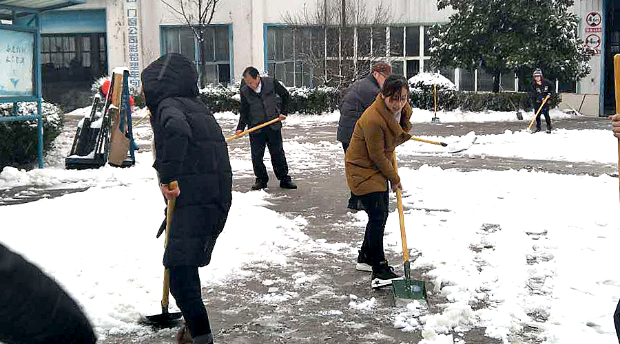 早上8點,員工們不畏嚴(yán)寒、冒著大雪準(zhǔn)時來到公司。在領(lǐng)導(dǎo)的帶領(lǐng)下,員工們開始揮舞著鐵鍬對集團附近以及路上的積雪和結(jié)冰進行清掃,大家你追我趕,齊心協(xié)力,配合默契,鏟的鏟、推的推、掃的掃,干的熱火朝天,不亦樂乎。忙碌的身影構(gòu)成了一道亮麗的風(fēng)景線。雖然室外溫度很低,但大家勞動的熱情和團結(jié)的力量讓這個冬日變得格外溫暖。