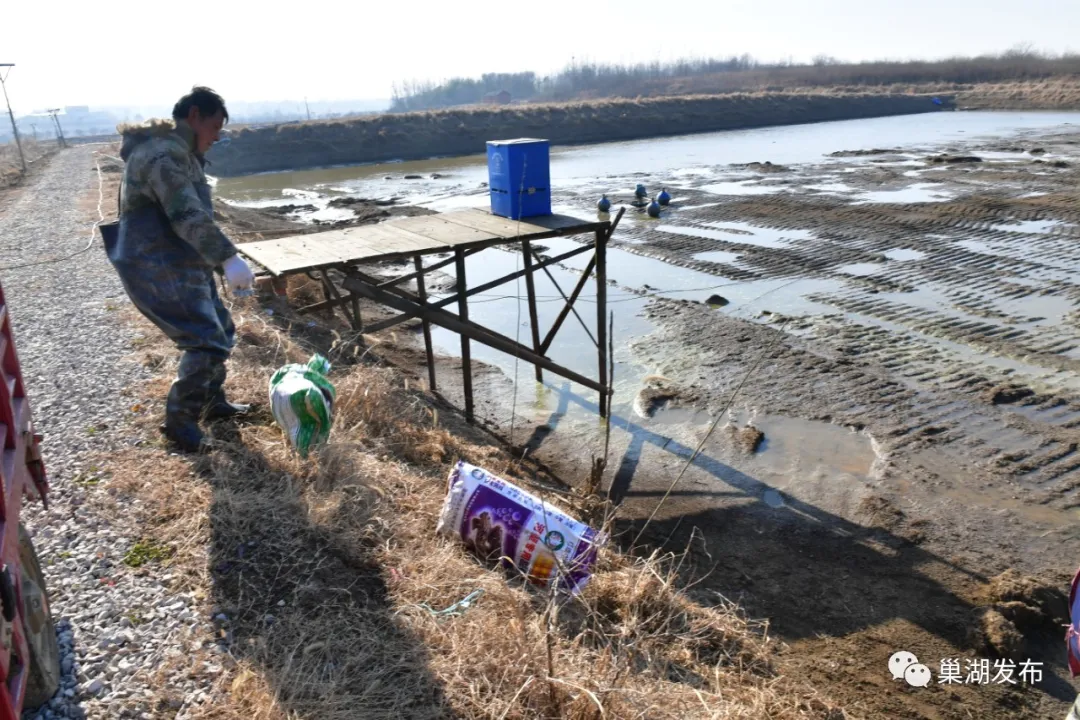 眼下正值隆冬季節(jié),巢湖大地寒風(fēng)微拂,陽(yáng)光和煦。黃麓鎮(zhèn)合群村鮰魚養(yǎng)殖產(chǎn)業(yè)園位于該村落山里自然村邊,在一口面積約20多畝的人工池塘里,合群村4位村民正站在已經(jīng)抽干的塘㡳,手拎塑料桶邊走邊播撒生石灰。